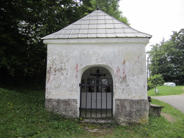 Eine Weile benütze ich nun die asphaltierte Zufahrtsstraße zum Hof Taurer (der aber auf der anderen Seite der Taurerkapelle liegt), vorbei am Hof Sulzer. Dann biege ich links ab und gehe zunächst am Rand einer Wiese, dann im Wald recht steil hinunter ins Jungherrntal. Noch einmal passiere ich einen (Pferde-)Hof, dann folgt eine lange Bergab-Querung im Wald, ehe ich zwischen zwei alten Häusern wieder auf die Gasse stoße, in der - wenige Meter links - mein Auto auf mich wartet.
