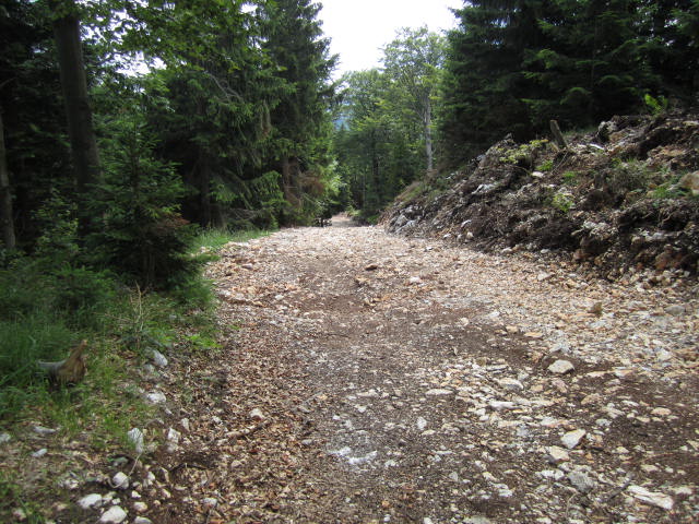 Letzlich kommen wir bei der Wegkreuzung wenige Minuten westlich des Öhlerschutzhauses heraus, wo wir eine kurze Pause machen. Bis hierher haben wir knapp 1 1/2 Std. gebraucht. Dann geht es weiter auf den Öhler. Der Beginn des Weges wurde grauslich verunstaltet von einer ganz neuen Forstautobahn!