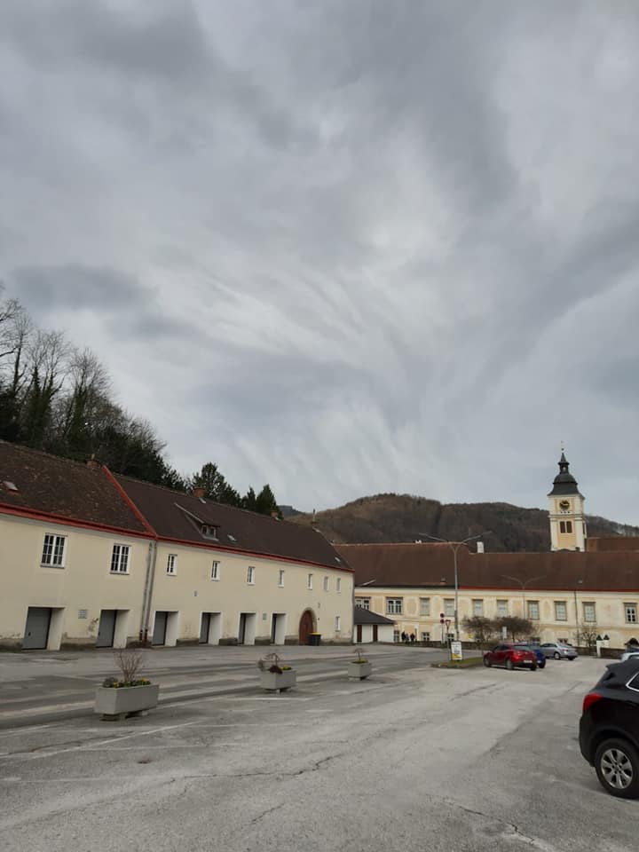 Stift Lilienfeld mit beeindruckenden Wolken - Fallstreifen (Virgae). Da verdunstet