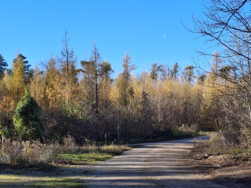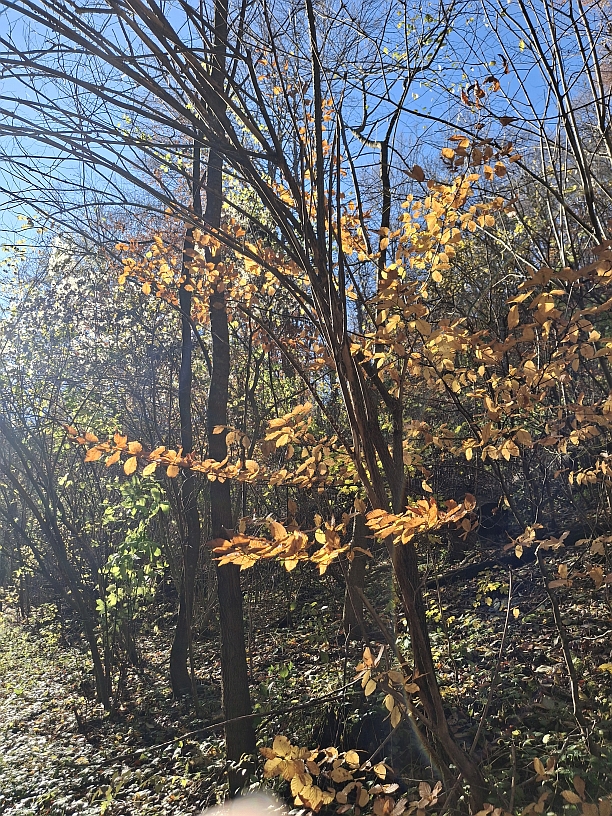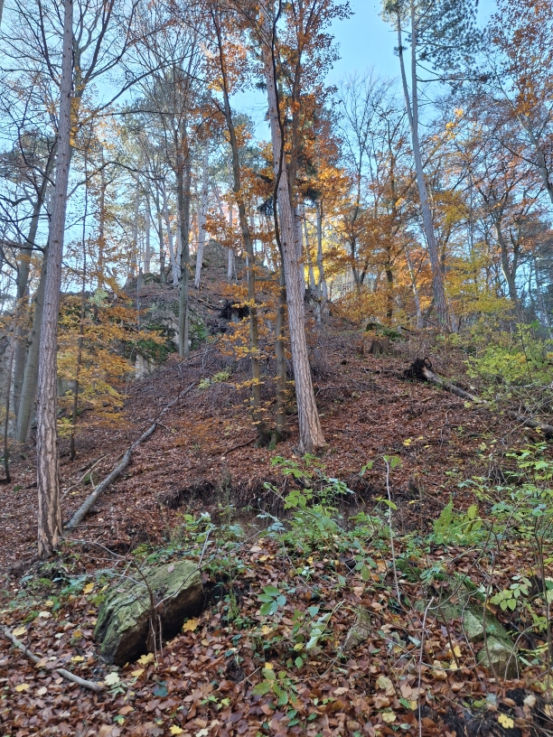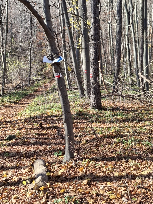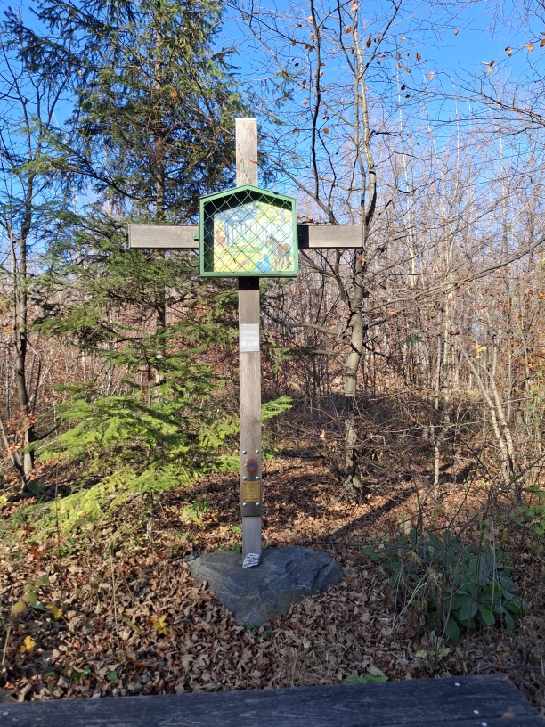 Ich gehe vorbei am Sender auf einem guten Weg hinunter zum Hirschenkreuz, hier scharf rechts auf einer Forststraße, dann benütze ich ein Pfaderl, das zunächst flach, dann steiler zur nächsten Forststraße hinunter führt. Auf dieser gehe ich rechts bis zum Steinernen Weg, den ich dann hinunter verfolge bis ins Helenental. Durch das viele Laub ist es etwas mühsam zu gehen, der Steinige Weg heißt nicht umsonst so. Und unten ist es sehr feucht, teilweise ist das Wegerl schmal, immer noch leichte Hochwasserschäden. Ich komme aber gut wieder beim PP an.